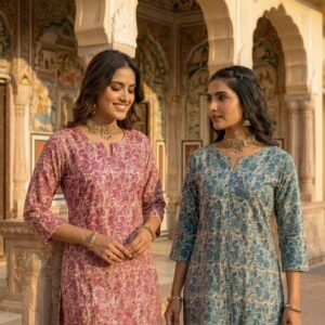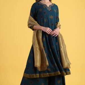 Blue Printed Sequins Flared Kurta & Flared Pants with Dupatta Set