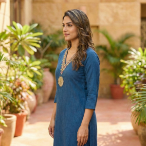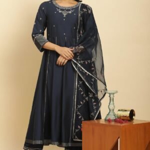 Dark Blue Zari Embroidered Festive Kurta, Pants and Dupatta Set