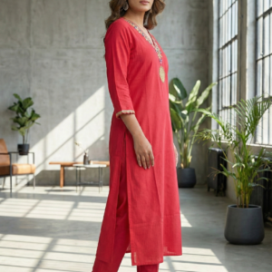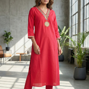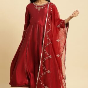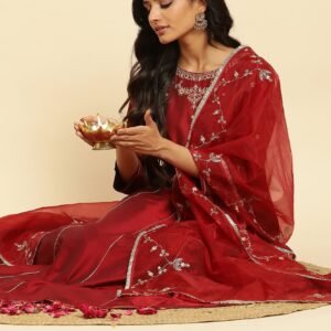Dark Red Zari Embroidered Festive Kurta, Pant And Dupatta Set