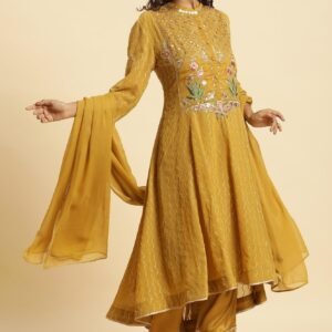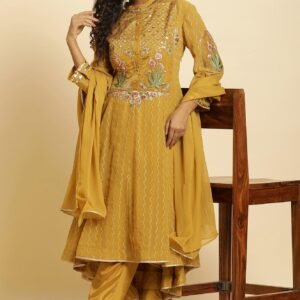 Yellow Embroidered Kurta, Pants And Dupatta Set