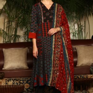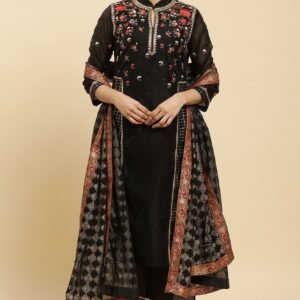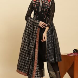 Black A-Line Chanderi Embroidered Kurta, Pants And Dupatta Set