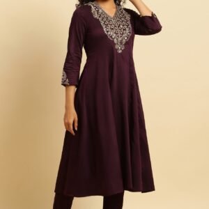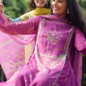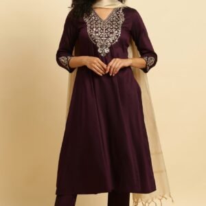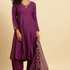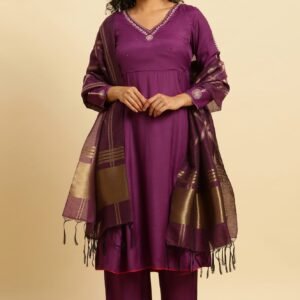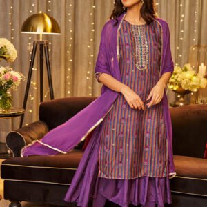 Purple Panelled Embroidered Kurta, Slim Pants And Dupatta Set