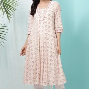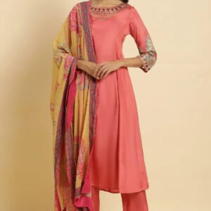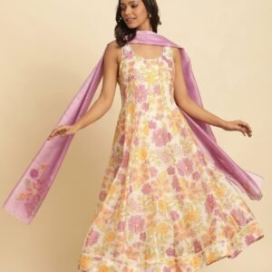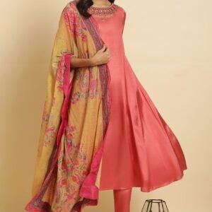 Pink Embroidered Anarkali Kurta, Pants & Printed Dupatta Set