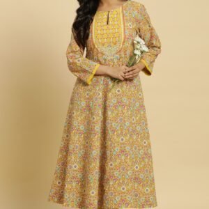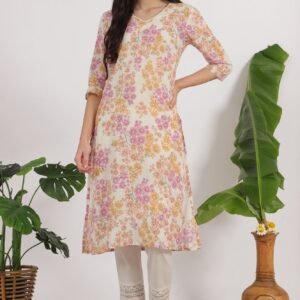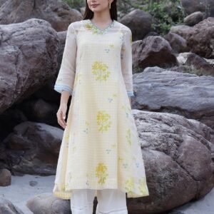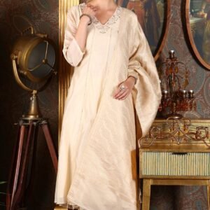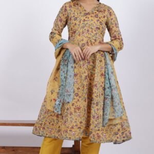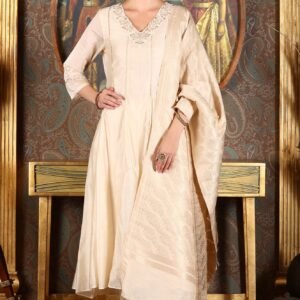 Beige Embroidered Flared Chanderi Kurta, Pants And Dupatta Set