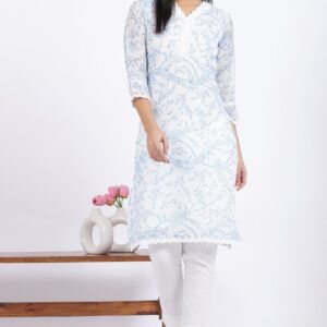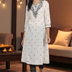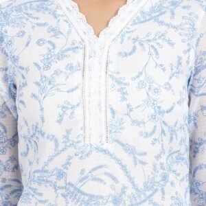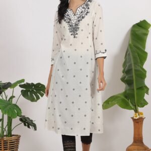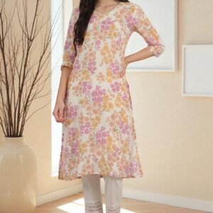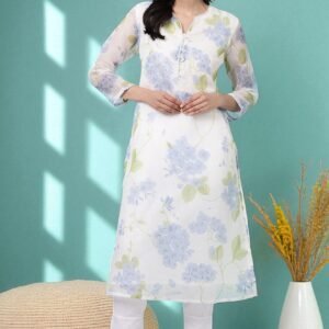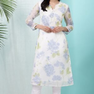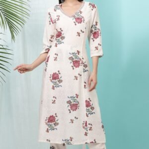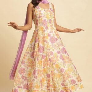 White Sleeveless Printed Flared Kurta, Pants And Dupatta Set