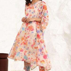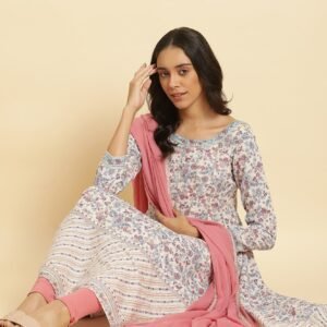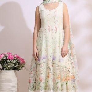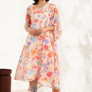 Cream Floral Printed Kota Sleeveless Anarkali Kurta, Pants and Dupatta Set