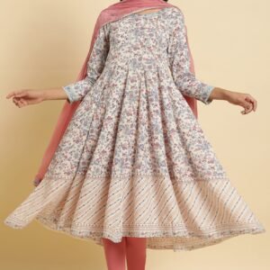 Cream Floral Printed Flared Kurta, Tights & Dupatta Set