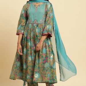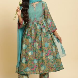 Dark Green Floral Printed Kurta, Pants & Dupatta Set