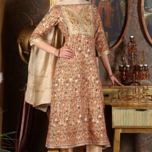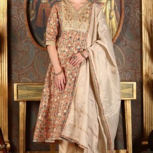 Beige Embroidered Flared Chanderi Kurta, Pants And Dupatta Set